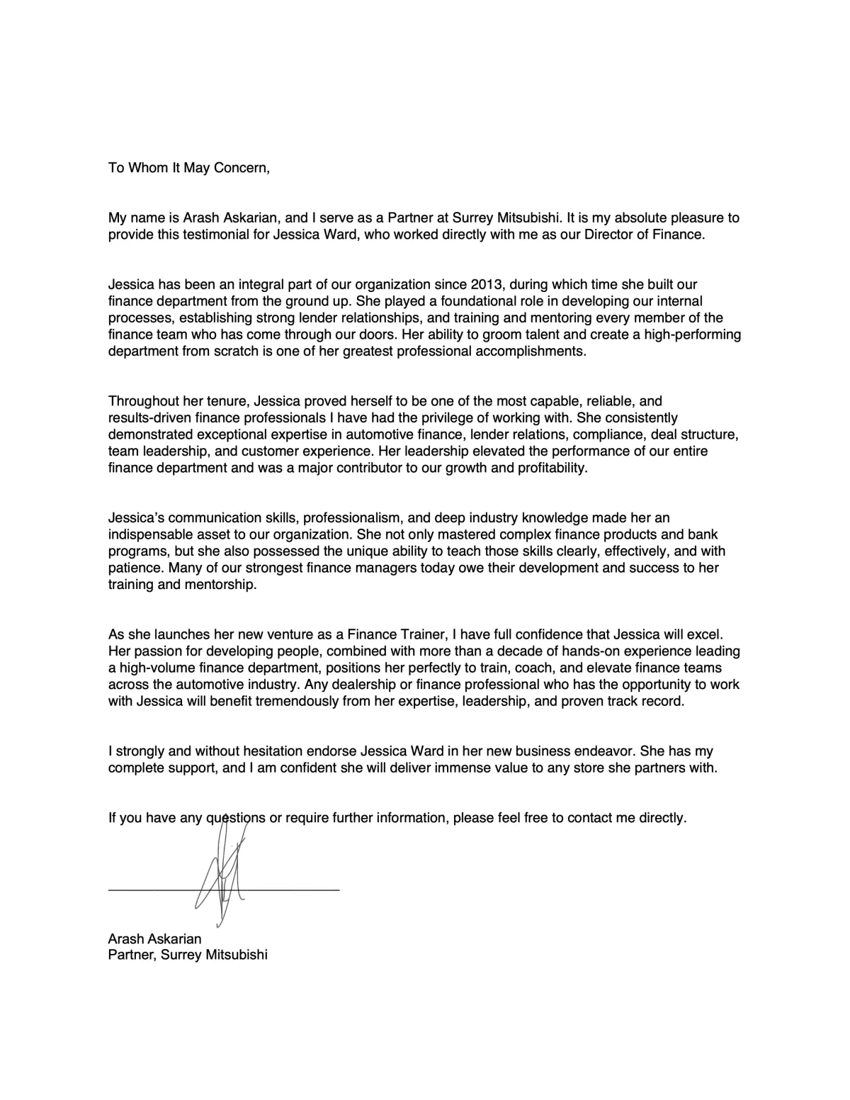 Jessicaβs expertise is backed by endorsements from respected industry partners and leaders such as Arash Askarian (Dealer Partner), testimonials from colleagues like Charlie Man (General Manager), and media features recognizing her work in modernizing automotive finance education.